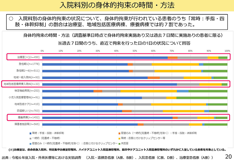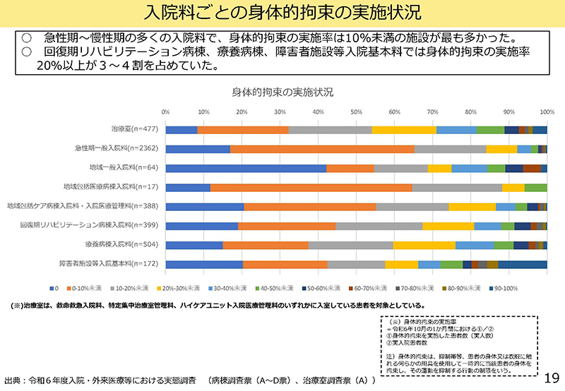 19ページでは、「回復期リハビリテーション病棟、療養病棟、障害者施設等入院基本料では身体的拘束の実施率20%以上が3~4割を占めていた」としている。