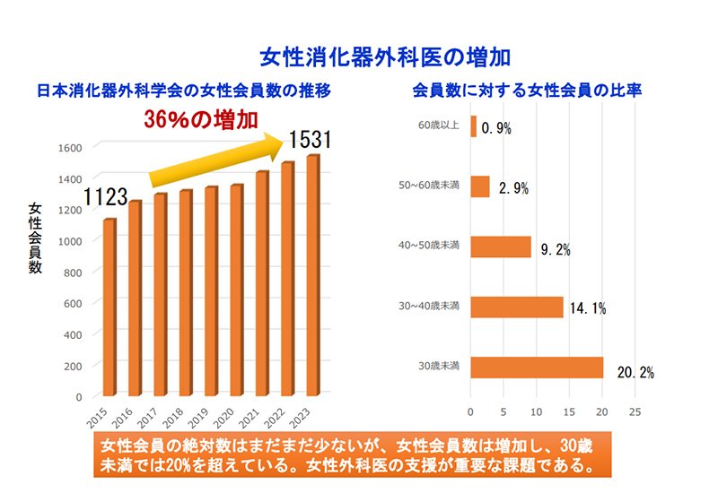 そのときに、調先生は「女性会員自体は全体の7%ではあるが、会員数は増加している。2015年から36%の増加を認めている」とし、また「年齢が若いほど女性の割合が高く、30歳未満では20%を超えている。したがって、日本消化器科外科学会にとって女性消化器外科医の支援は非常に重要な課題と考えている」と述べている。