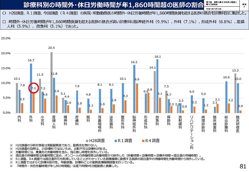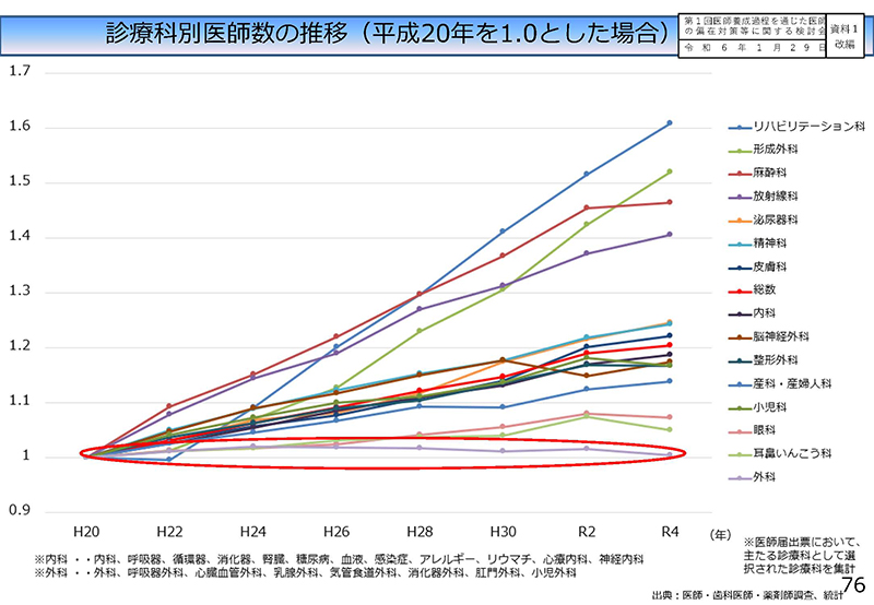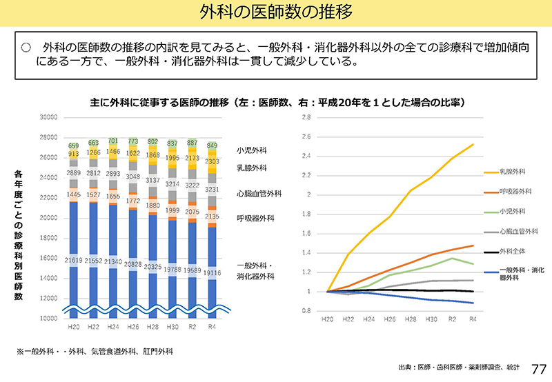 76ページ以降、外科の医師数に関するデータとあわせて、今後、一般外科・消化器外科医が減少してくることが非常に問題になるというデータが示された。