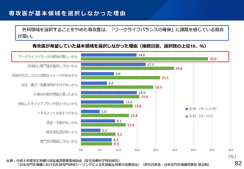 確かに、そのとおりだと思うが、私は82ページで、全体との比というものに注目した。「ライフワークバランスの確保」の困難は全体と比べると約2.3倍。その次にあるのが「医師が不足しており過酷なイメージがあるから」で、これが2.4倍ぐらいある。