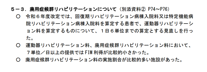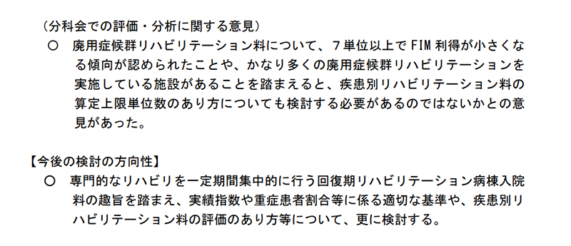 次のページに、「分科会での評価・分析に関する意見」として、「廃用症候群リハビリテーション料について、7単位以上で FIM 利得が小さくなる傾向が認められたことや、かなり多くの廃用症候群リハビリテーションを実施している施設があることを踏まえると、疾患別リハビリテーション料の算定上限単位数のあり方についても検討する必要があるのではないかとの意見があった。」と書かれている。