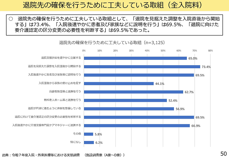 私からは3点述べる。まず1点目は50ページについて。「退院先の確保を行うために工夫している取組」というグラフがある。