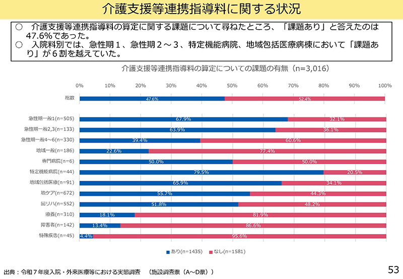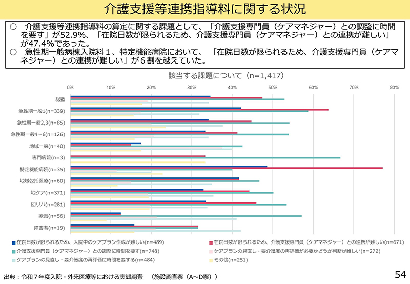 ただ、53ページにあるように、20.5%、9施設の特定機能病院は「課題なし」と答えている。在院日数という点では同じであると考えると、この違いは、ケアマネそのものに連絡がつきやすいか付かないかという話になってくる。ケアマネとの調整に時間を要すれば何が起こるかというと、当然、入院中のケアプラン作成が困難になるし、それから、ケアマネとの連携が難しいということになる。