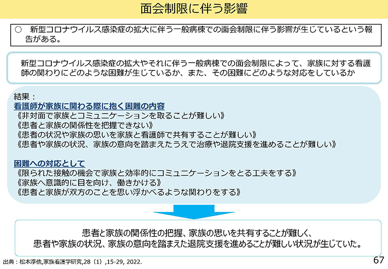 67ページにあるような面会制限による患者や家族への影響というのは、われわれもよく理解しているが、一方で面会制限を全く実施しなかった場合のリスクも熟知している。新型コロナウイルスは変異し続けており、現在、話題になっている「ニンバス」のように、感染すると咽頭痛がひどくて、高齢者の方は飲み込めないとか、食事が全然とれない方がどんどん増えている。