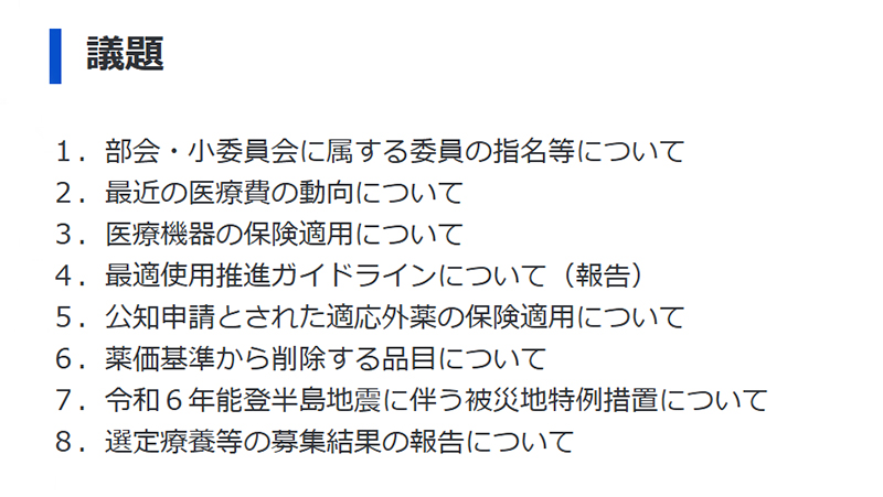 この日は総会と薬価専門部会が開かれた。診療側委員として新たに就任した黒瀨巌委員(日本医師会常任理事)の所属部会等を決めた後、総会は一時中断。続く薬価専門部会で関係業界からのヒアリングを実施した後、議題2から総会を再開した。