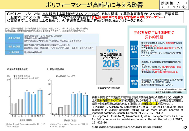 42ページにあるように、高齢者に関わる多剤服用の具体的問題等がある。医薬局の「高齢者医薬品適正使用検討会」で数年にわたり議論し、「高齢者の医薬品適正使用の指針」の「総論編」「各論編(療養環境別)」という冊子が出ている。