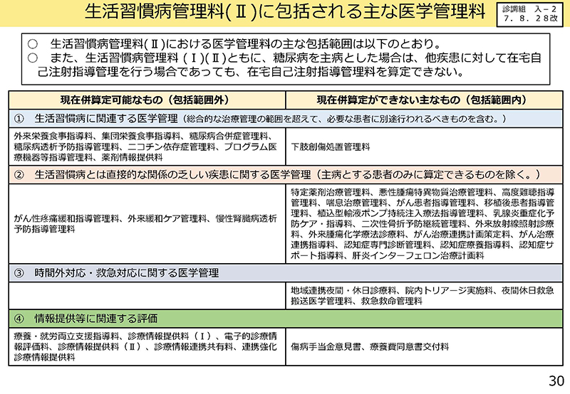 30ページ。「生活習慣病管理料(Ⅱ)に包括される主な医学管理料」の資料の丸2つ目に、「糖尿病を主病とした場合は、他疾患に対して在宅自己注射指導管理を行う場合であっても、在宅自己注射指導管理料を算定できない」とある。