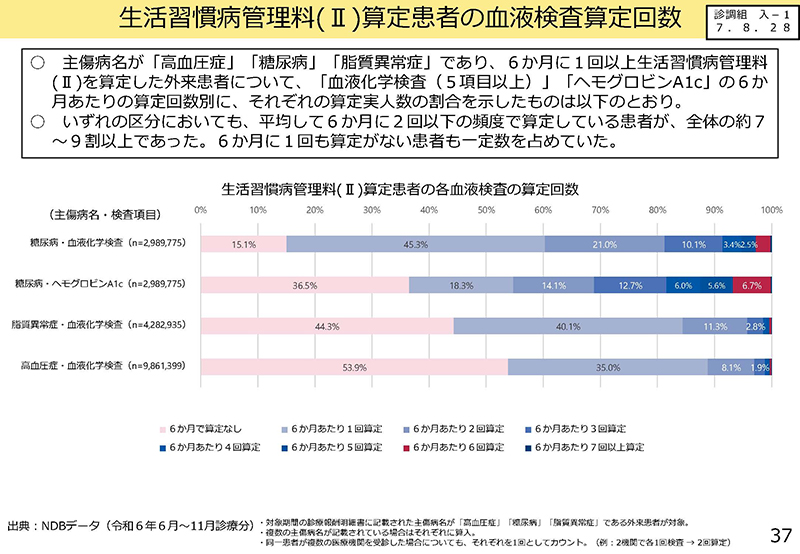 生活習慣病の管理等について厚労省は、血液検査の頻度に関するデータを提示。「6か月に1回も算定がない患者も一定数を占めていた」などのデータを紹介した。