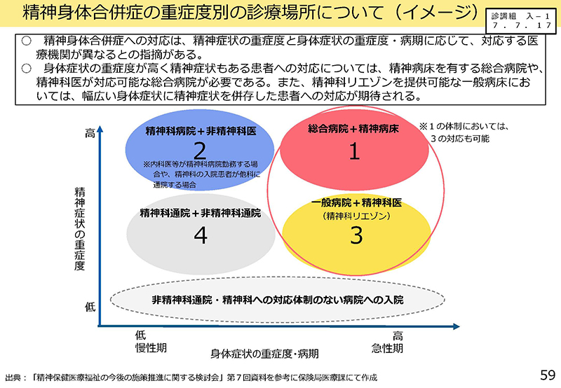 59ページに1・2・3・4というクリアカットな図が出ている。「精神症状の重症度」の高低と「身体症状の重症度・病期」で4つで分けている。こうした患者さんがどの程度のボリュームがあり、あるいは、そこを支えられる病院がその地域にどれくらいあるのか、必要なのか、そういうことも検討しながら、基本的には身体合併症をしっかり診られる体制に対しては、何らかの評価をしっかりつけなければいけない。このことも強調しておきたい。