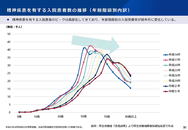 30ページにもあるように、精神疾患を持っている方も、どんどん高齢化が進んでいる。