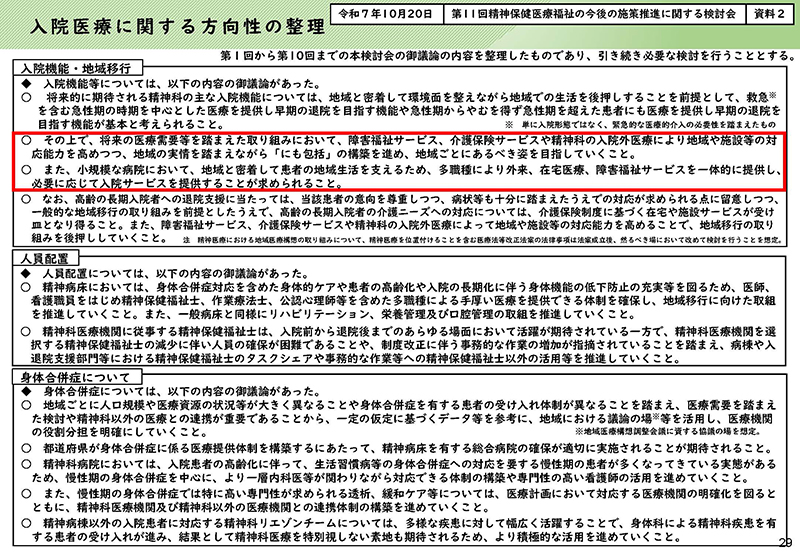 地域包括ケアシステムが中学校区くらいのエリアを想定していると考えると、「にも包括」に必要な精神科の病院というのは、やはり病床数が小さい、ある程度、規模が小さい病院であり、そうした小規模な病院がしっかり支える。一般病床で言えば地域包括ケア病床・病棟等が支えることになるかと思う。