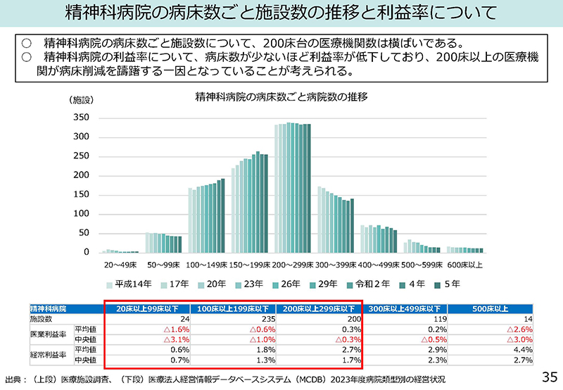 その小さい規模の病院は、35ページにあるように利益率が非常に低くなっており、経営が厳しい状況になりつつある。ということは、ここをしっかりと、まず下支えをしていただかなければいけない。精神疾患への対応について、「施設から地域へ」という大きな流れがある中で、小規模な病院を下支えする。地域包括ケアシステムを支えるための精神科入院医療を担っているところをしっかり支えなければいけない。小規模な病院が非常に厳しいということを、しっかり押さえなければいけないと思っているので、強調しておきたい。