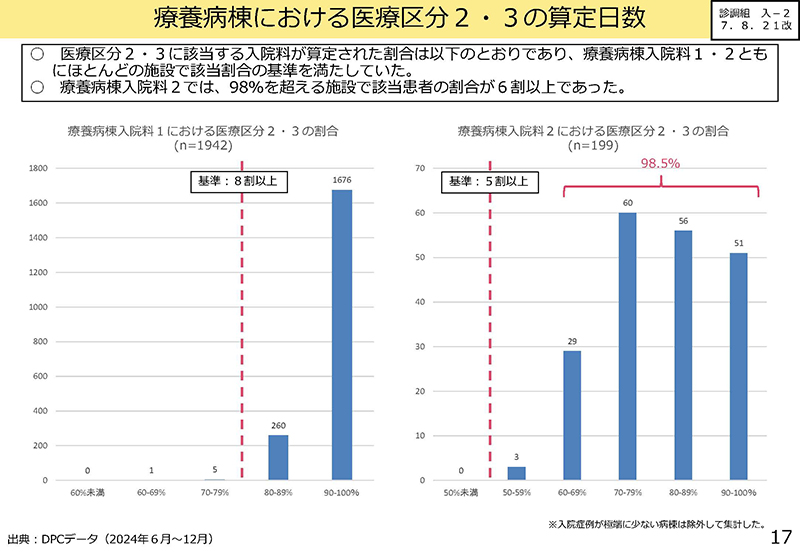 17ページにあるように、入院料2においても医療区分2・3の割合が6割を超える医療機関が98%以上ある。そこで、入院料2の医療区分の基準「5割以上」を一定程度、引き上げること、例えば「6割」に上げるということについて、調査結果から見て、一定程度の整合性があることは理解できる。
