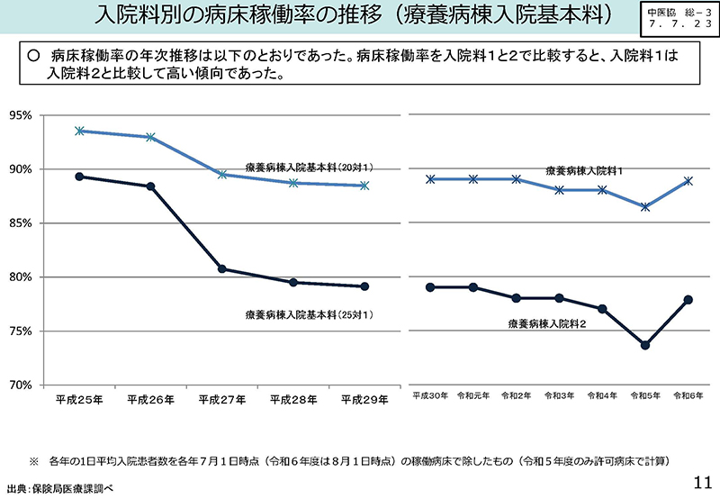 一方、11ページにあるように、入院料2の病床稼働率は、入院料1に比べて1割以上低くなっている。なおかつ、療養病棟においては入院料1も2も、看護配置基準は同じ20対1であることに鑑みると、ただでさえ非常に厳しい経営状況にあることは間違いない。