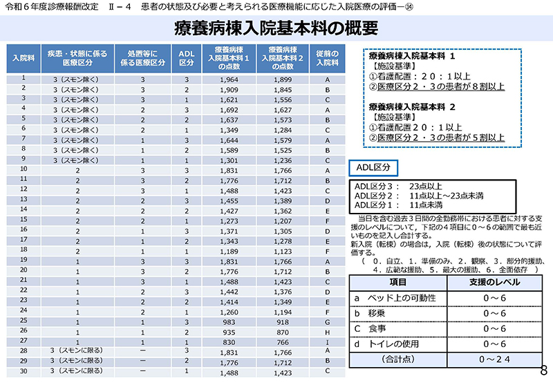 前回の令和6年度診療報酬改定では、医療区分が大きく見直され、「疾患・状態」に係る医療区分と「処置」に係る医療区分に基づいて入院料が30区分に細分化された。