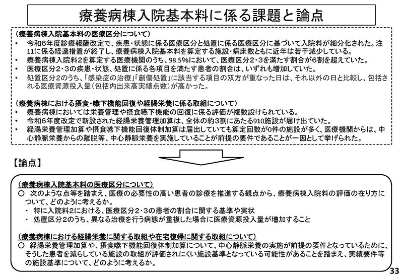 論点に沿って何点かコメントさせていただく。まず、33ページの療養病棟入院基本料に係る論点の1つ目、療養病棟入院基本料の医療区分について。
