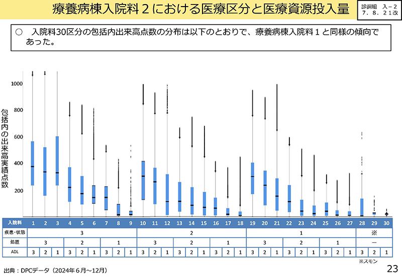 このうち論点①については、▼入院料2における、医療区分2・3の患者の割合に関する基準や実状、▼処置区分2のうち、異なる治療を行う病態が重複した場合に医療資源投入量が増加すること──を挙げ、「医療の必要性の高い患者の診療を推進する観点から、療養病棟入院料の評価の在り方について、どのように考えるか」と意見を求めた。