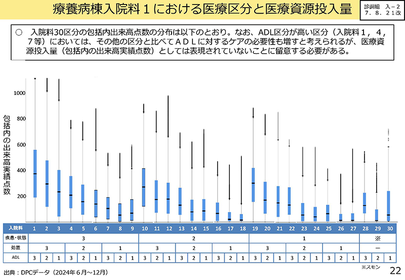 そして、もう1つ。医療資源投入量だけで考えるべきではない。ADL区分3・2・1の違いは医療資源投入量だけでなく、ADLが上がるごとによってケアの仕方が重くなってくる。あるいは、実際に診察をする時間や指示も多くなる。観察する時間、医師・看護師がきちんとケアをする時間、あるいは指示を変更する時間、いろいろな人の手間が、医療資源投入量以外のところに入っている。