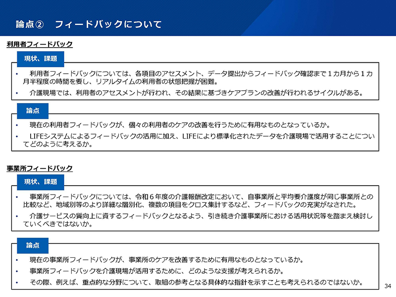 ②では、現在のフィードバックが「個々の利用者のケアの改善を行うために有用なものとなっているか」などの論点を挙げている。中尾副会長の発言要旨は以下のとおり。