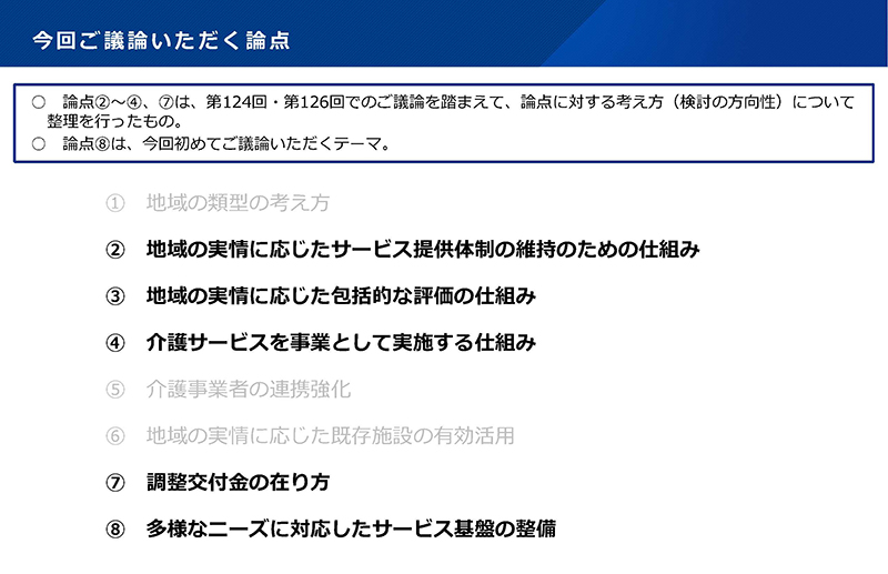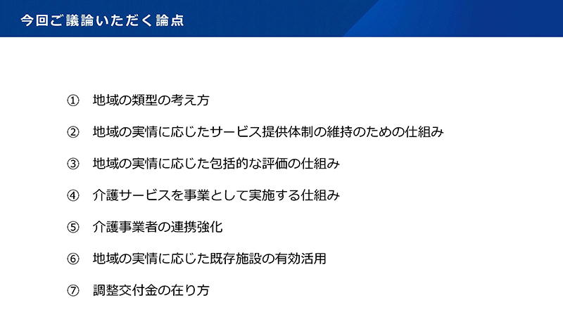 今回は、①⑤⑥を除いた4項目のほか、新たに⑧(多様なニーズに対応したサービス基盤の整備)を加えた計5項目の論点について、「検討の方向性」などが示された。