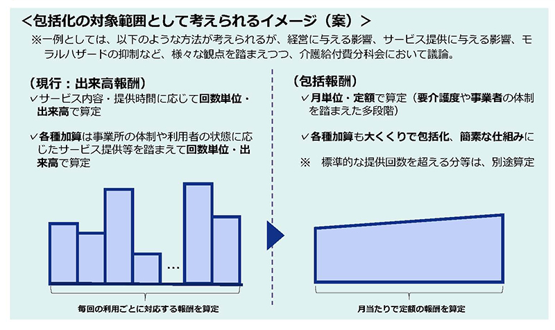 このうち論点③では、「中山間・人口減少地域の事業者が、安定的な経営を行うための報酬の仕組みとして、特例介護サービスの新たな類型の枠組みを活用して、例えば、訪問介護について、包括的な評価(月単位の定額払い)を選択可能とする」とした上で、「包括化の対象範囲として考えられるイメージ(案)」を示した。