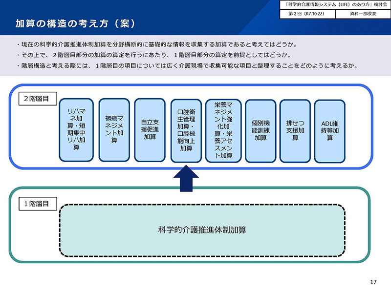 こうした議論を踏まえ、秋下座長が事務局に質問。「(見直しの)たてつけとして、科学的介護推進体制加算が基盤にあって、その上に各種加算が乗っかるというイメージで今、議論しているのだと思うが、例えば、ケアをマネジメントするケアマネジャーのところで科学的介護推進加算を取って、その上に乗っかる部分は各事業所が提供するもので取っていくということも理論的にはあり得るか」と尋ねた。