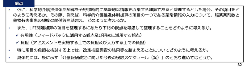 前回までの議論を踏まえ今回は、▼1.LIFE関連加算項目の見直しの観点、▼2.LIFEの対象範囲──の2項目について論点が示された。