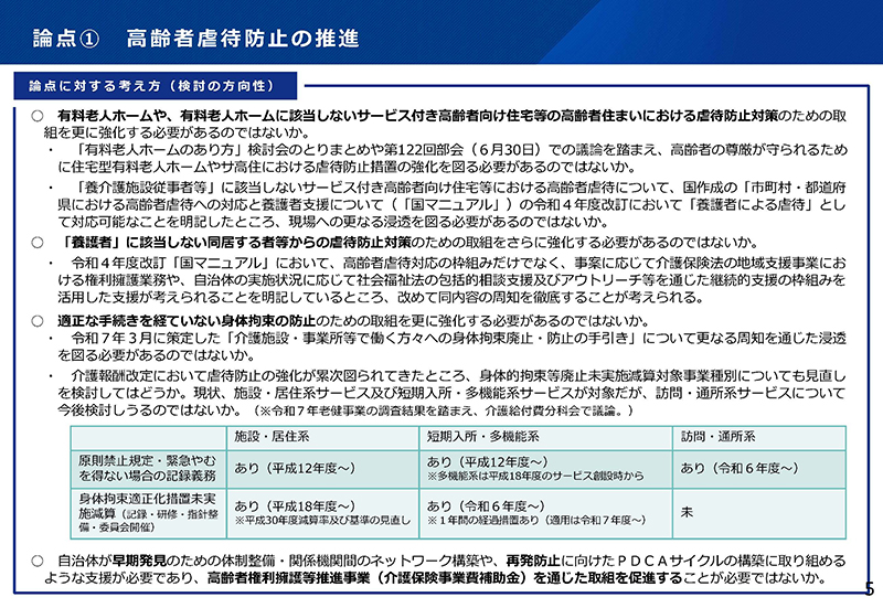 このうち、論点①「高齢者虐待防止の推進」では、「有料老人ホームや、有料老人ホームに該当しないサービス付き高齢者向け住宅等の高齢者住まいにおける虐待防止対策のための取組を更に強化する必要があるのではないか」との検討の方向性が示された。