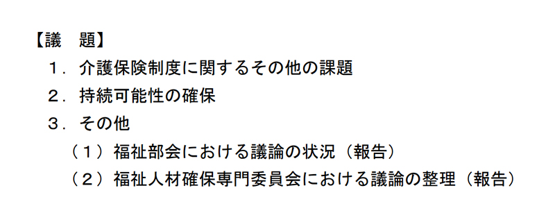 この日の議題は、3項目。議題1(介護保険制度に関するその他の課題)では6項目の論点、議題2(持続可能性の確保)では10項目の論点が示されたほか、議題3では福祉人材確保に関する議論の状況が報告された。