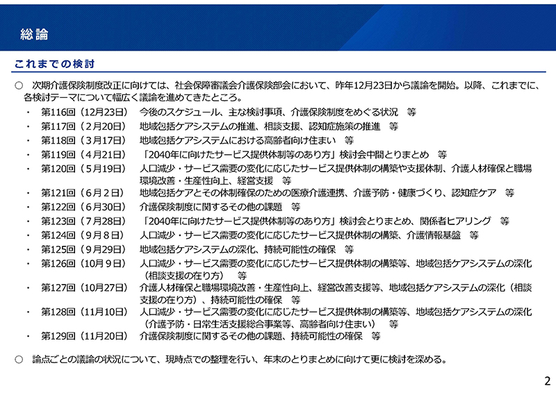 厚労省は同日の部会に「論点ごとの議論の状況」を提示。これまで議論を踏まえ、「認知症施策の推進」「多様なニーズに対応した介護基盤の整備」などについて検討の方向性を示し、委員の意見を聴いた。
