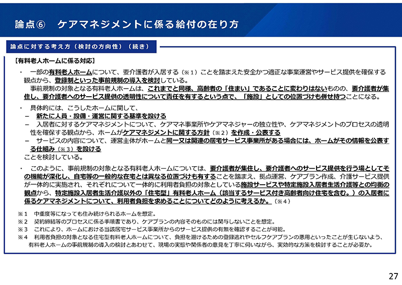 資料1の論点⑥(ケアマネジメントに係る給付の在り方)の「有料老人ホームに係る対応」について意見を述べる。