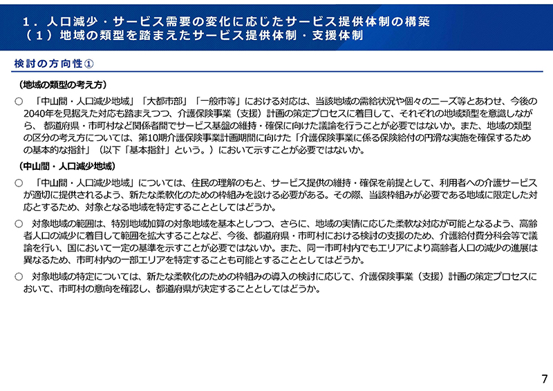 資料1の7ページ。「中山間・人口減少地域」「大都市部」「一般市等」に分けた上で、対象地域の範囲については、「特別地域加算の対象地域を基本としつつ、さらに、地域の実情に応じた柔軟な対応が可能となるよう、高齢者人口の減少に着目して範囲を拡大することなど、今後、都道府県・市町村における検討」としている。
