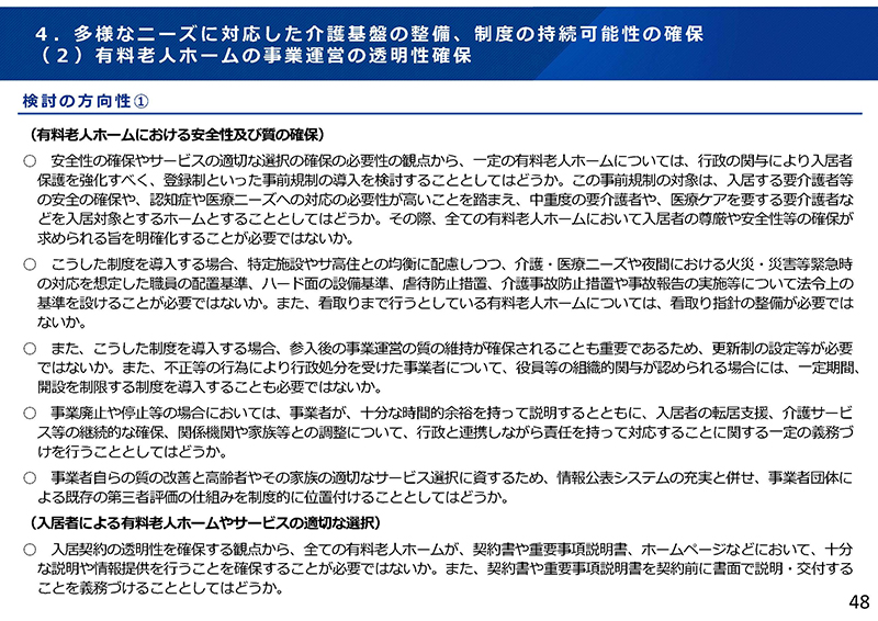 透明性を進めることは必要であるが、資料に書かれているような「新たに人員・設備・運営に関する基準を設ける」というのではなく、例えば、虐待や身体拘束、事故報告などに焦点を当てたほうがいいのではないか。新たに基準を設けるとなると、介護保険制度における他の施設との差が一般の人だけでなく、医療者にもわかりにくくなってしまうと思う。つまり、有料老人ホームは、ある程度、自由度があるところが利点なので、そこは崩さないほうがいいと思う。