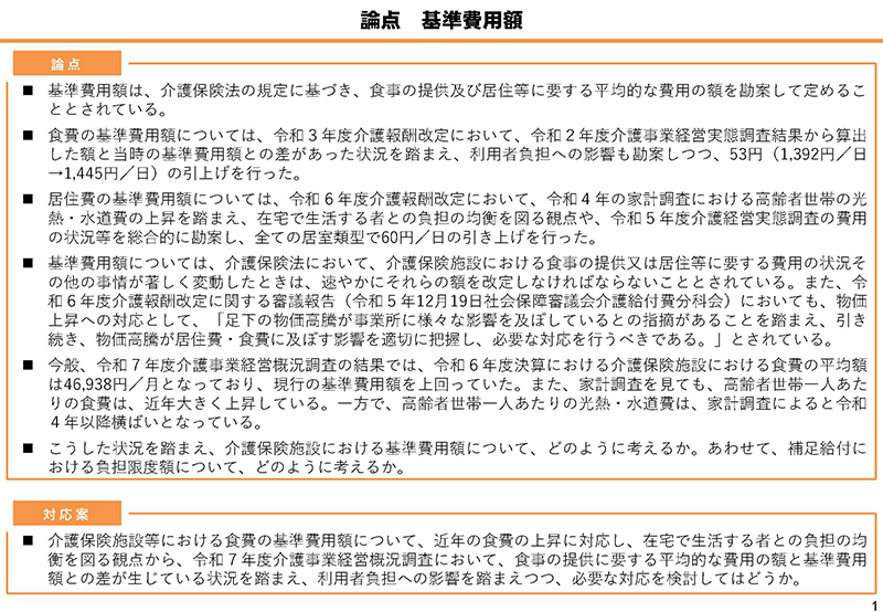 議題③では、介護保険施設等における食費の基準費用額について「利用者負担への影響を踏まえつつ、必要な対応を検討してはどうか」との対応案が示された。