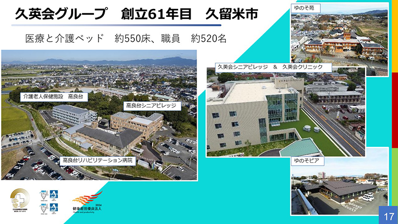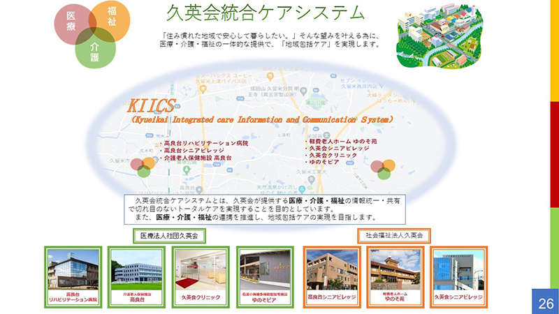 久英会グループの理念は「医療・介護・福祉の一体的提供により地域社会のまちづくり」である。主な特長は、グループ内での医療・介護・福祉の連結と融合、グループ内での情報共有ツール(KIICS)、地域の住民と我々働き手すべてのwell-beingの追求(健康経営)。そして、グループ内すべての施設で約10年間、身体拘束はゼロである。