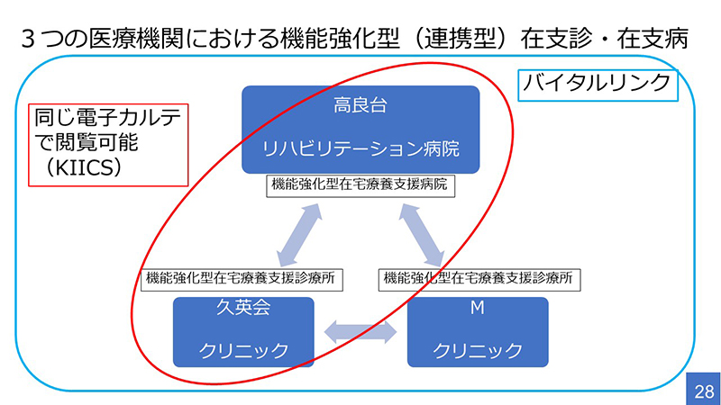 では、グループ外の診療所とはどのように連携しているか。例えば、「Mクリニック」とはバイタルリンクというまた別のICTで連携している。これにより「在宅あんしんサポート隊」という取り組みをしている。1人の医師が24時間365日ずっと診ることはできないので、バックアップ体制をとる。