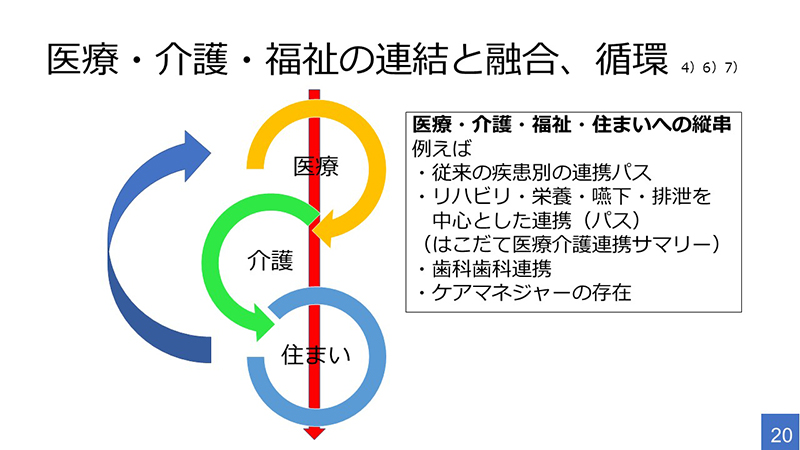 医療・介護・住まいには、しっかりとした縦串が必要だ。その縦串は、従来の疾患別の連携パスのほか、リハビリ・栄養・嚥下・排泄を中心とした連携パス(はこだて医療介護連携サマリー)、歯科歯科連携、 ケアマネジャーの存在である。この縦串が一気通貫でしっかりとあって、これがグルグル循環するのが高齢者の医療・介護であると思う。