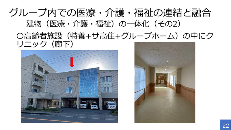 中尾副会長は「医療・介護・住まいを一気通貫した“縦串”がしっかりあって、これがグルグル循環するのが高齢者の医療・介護・福祉」との考え方を示し、高齢者施設内にクリニックを配置する「建物の一体化」や、グループ内での情報共有ツール「KIICS」の活用による多職種連携などを紹介。「早期介入により重篤な進行を予防できる」と伝えた。