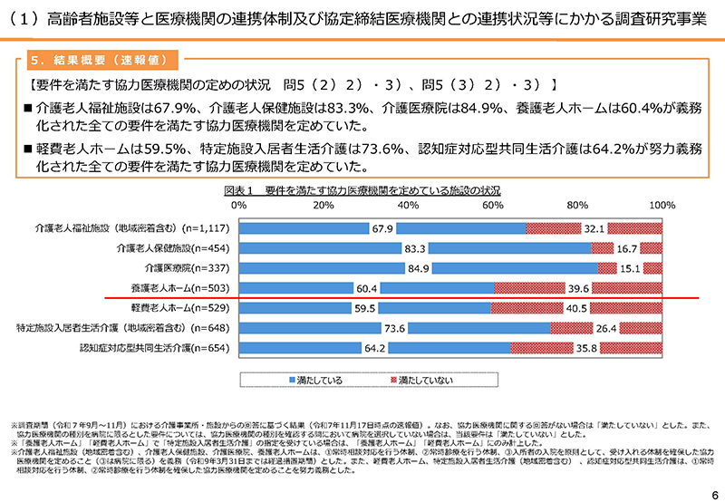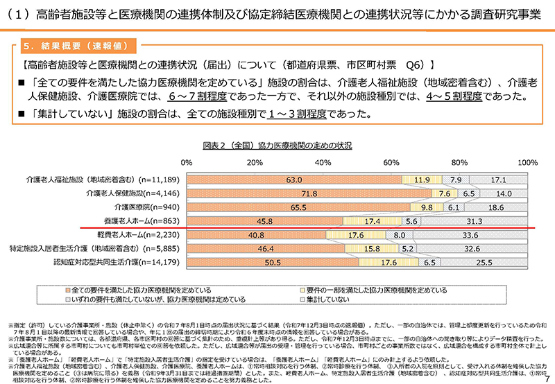 今回の資料は、令和7年度調査のうち「(1)高齢者施設等と医療機関の連携体制及び協定締結医療機関との連携状況等にかかる調査研究事業」の一部を速報としてまとめたもの。