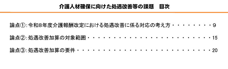 厚労省は同日の分科会に「介護人材確保に向けた処遇改善等の課題」と題する資料を提示。その中で、「令和8年度介護報酬改定における処遇改善に係る対応の考え方」など論点①~③を挙げた上で、「取得要件(案)」「令和8年度改定のイメージ図」などを示し、委員の意見を聴いた。