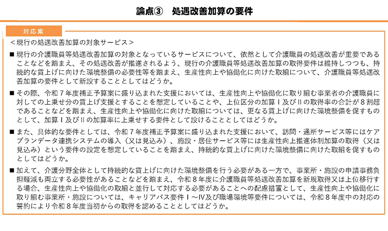 処遇改善加算の要件(論点③)について厚労省は「令和7年度補正予算案に盛り込まれた支援においては、生産性向上や協働化に取り組む事業者の介護職員に対して賃上げ支援を上乗せすることを想定」との考え方を示した。