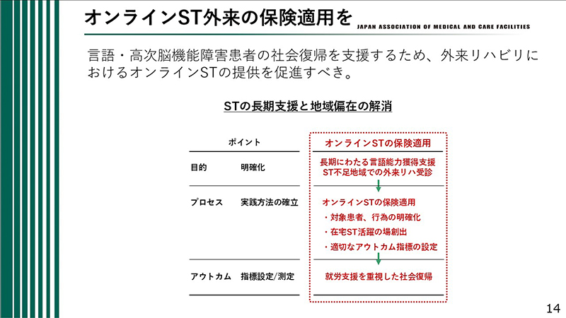 ST人材は地域によって大きく偏在している。STが不足する地域では外来リハビリの受診そのものが困難であるという課題がある。この問題を解消したいと考えている。オンラインによるSTリハビリが保険適用されれば、地域偏在の解消にも大きく寄与すると考える。オンラインSTの保険適用を求めたい。