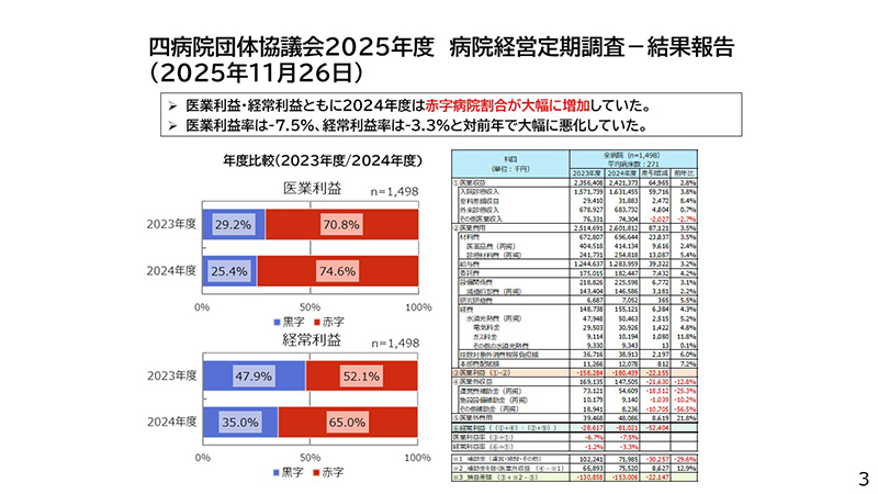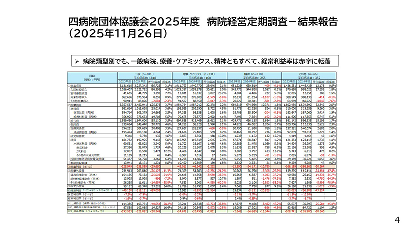 四病院団体協議会が実施した2025年度病院経営定期調査(2025年11月26日)の結果を示す。本調査は、厚生労働省が実施している医療経済実態調査とは別に、四病院団体協議会として独自に取りまとめたものであり、有効回答数は約1,500病院である。