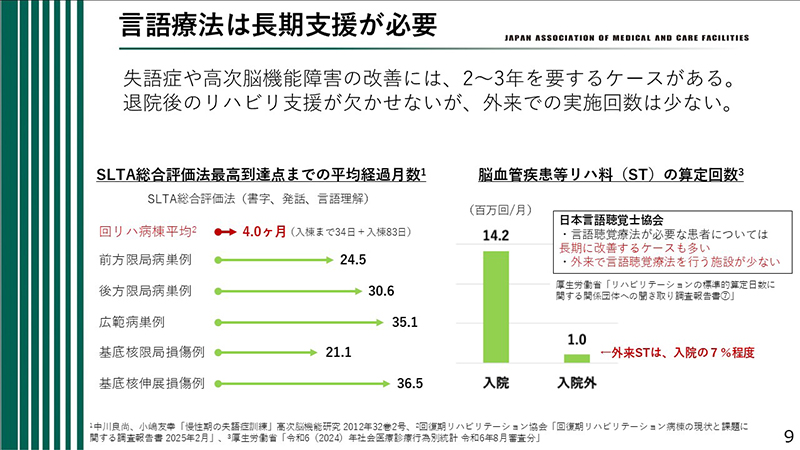 本提言の目的は、長期にわたる言語能力獲得支援の確保と、STが不足する地域における外来リハビリ受診の促進である。脳卒中などにより発話が困難になる患者は多く、そのリハビリは3カ月や半年といった短期間ではなく、年単位で継続する必要がある。当院においても、患者と家族が通院しながらリハビリを続けている。その際、「発話が改善するには1年から2年を要するが、少しずつ必ず良くなるため、長く継続することが大切」と説明している。長期的な言語能力獲得支援が不可欠である。