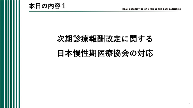 本日の会見では、最初に池端副会長から「次期診療報酬改定に関する日本慢性期医療協会の対応」について説明していただき、続いて橋本会長からオンラインST外来の保険適用に関する提言を示す。