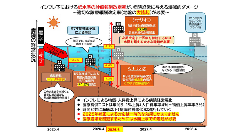 この日の会見には、池端副会長が出席。病院経営に関する調査結果などを踏まえ、「病院への2026年度診療報酬改定率については、10%超が必要」と訴えた。池端副会長は、インフレ下における低水準の診療報酬改定率が病院経営に与える壊滅的ダメージについて模式図を用いて説明。“水面下”に沈んだ病院経営を立て直し、「医療崩壊を回避するためには水面上までの隆起が必要」と強調し、「10%」の根拠を示した。