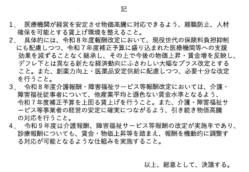 続いて、鈴木俊一幹事長、後藤茂之議員、加藤勝信議員、福岡資麿議員の4人が激励の挨拶を述べた後、医療・介護・福祉団体の代表ら15人が決意表明。古賀篤議員が決議案を読み上げた。