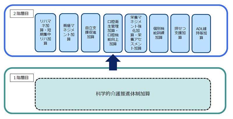 これに対し、今回の整理案では「科学的介護推進体制加算」を分野横断的に基礎的な情報を収集する「1階層目」の加算と位置づけ、その他の専門的なLIFE関連加算を、その上に積み上げる「2階層目」とする2階層構造への転換が提言された。これにより、重複入力の解消とデータ収集の効率化が図られる見通し。