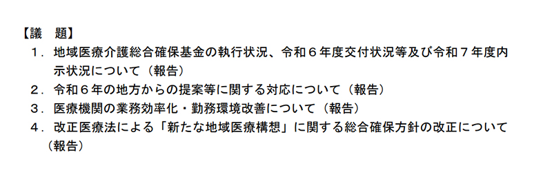 この日の会合では、地域医療介護総合確保基金の執行状況や令和6年度の交付状況等について報告があったほか、改正医療法による「新たな地域医療構想」に関する総合確保方針の改正案について説明があった。