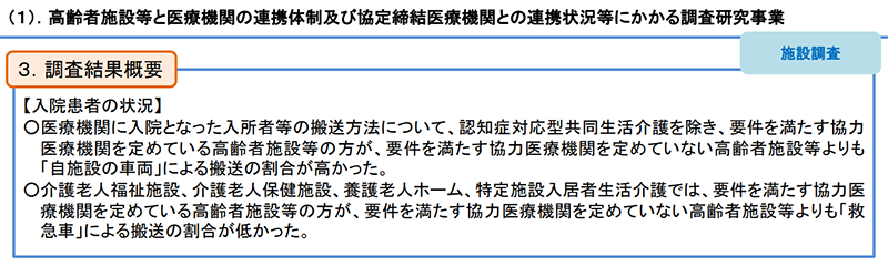 このうち「1-1」の結果によると、連携先の医療機関を定めている介護施設では「自施設の車両」による搬送の割合が高い状況が示された。